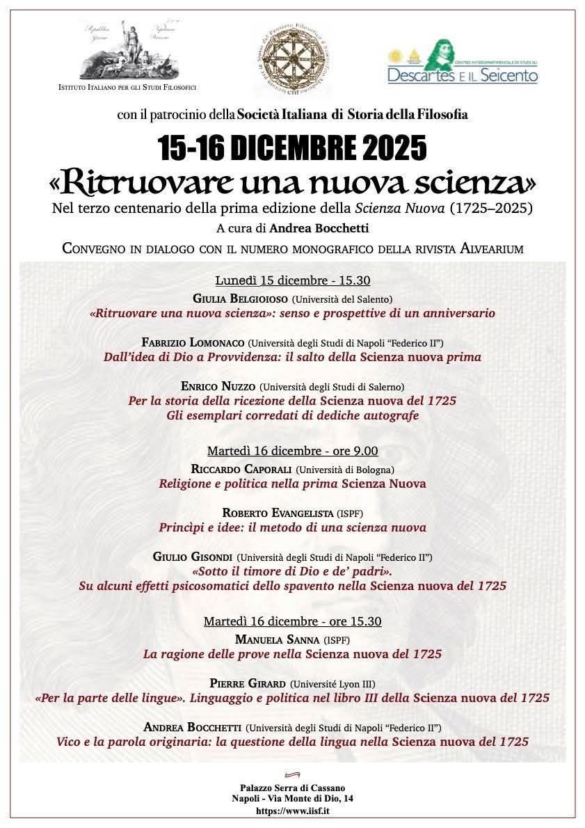 Il 15 e 16 dicembre 2025, presso Palazzo Serra di Cassano a Napoli, si terrà il convegno “Ritrovare una nuova scienza”, organizzato dall’Istituto Italiano per gli Studi Filosofici con il patrocinio della Società Italiana di Storia della Filosofia.