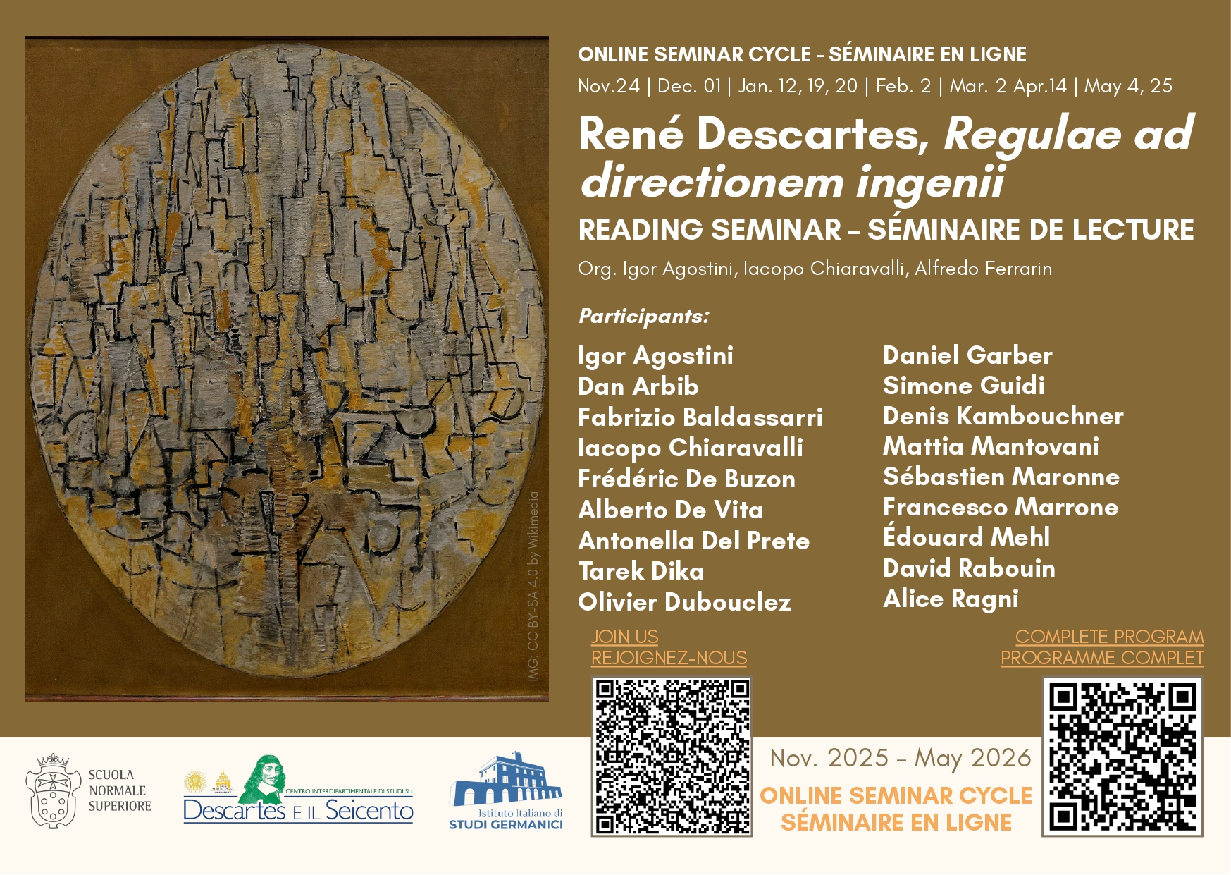 The Centro Dipartimentale di Studi su Descartes « Ettore Lojacono » (University of Salento) is pleased to announce the start of the online seminar “René Descartes, Regulae ad directionem ingenii” on Monday, November 24, 2025, at 5:30 p.m. (CET), organized by the Centro, the Scuola Normale Superiore (Pisa), and the Italian Institute of Germanic Studies (Rome). The seminar will be held monthly and, except in special cases, will take place on Mondays from 6:00 p.m. to 8:00 p.m. (CET). It will consist of a reading and discussion of the full text of Descartes' Regulae ad directionem ingenii. Each meeting will feature commentary on a section of the text, with presentations by experts on the topics in question, followed by a debate. The presentations and debate will be held in English or French. The seminar is open to anyone interested. Attached is the flayer with speakers, dates, and the link to participate.